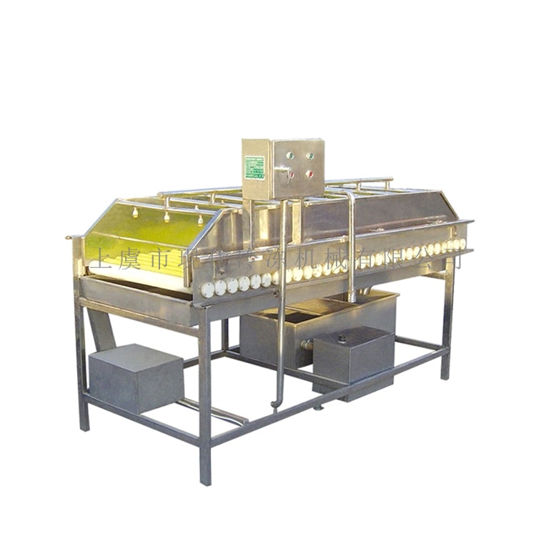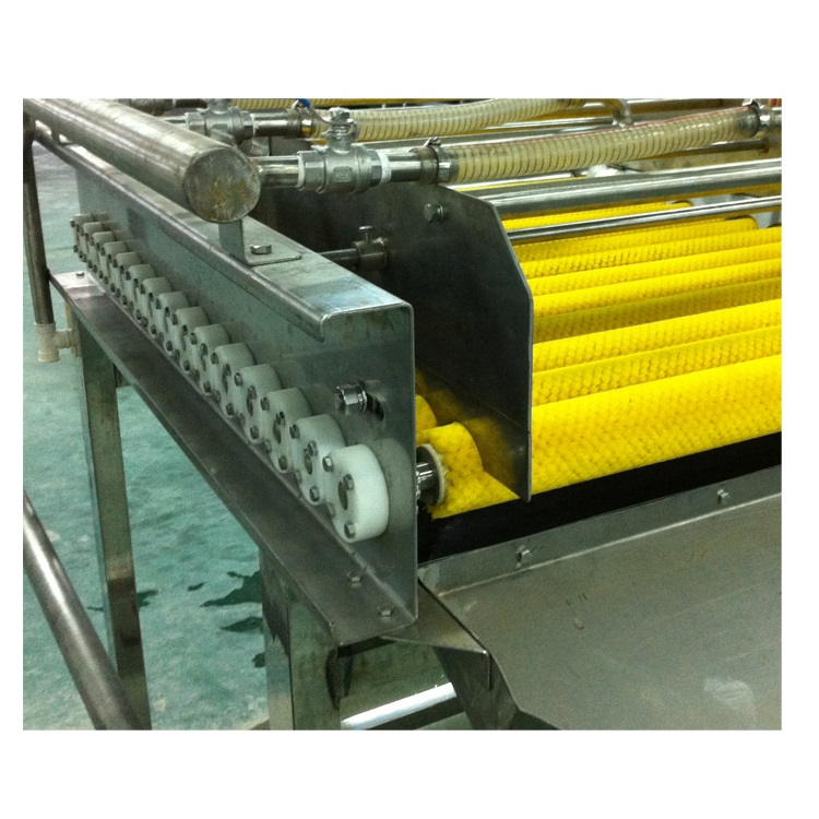 2、 十五和三十輥毛刷清洗機:物料在運動的毛刷上不停的向前運動,使毛發(fā)類雜質粘附在毛刷上,經過上部淋水管的淋水清洗,達到清洗的目的。3、 日本式毛刷刷洗機:物料在水中經氣泡作用呈翻滾并充分散開,與旋轉的大毛刷輥充分接觸,使毛發(fā)類雜質粘附在毛刷輥上,同時,產品在水流的作用下不停向前運動,通過輸送帶至水池外旋轉的小毛刷輥上,把殘留在產品中的毛發(fā)類雜質黏住并將產品送入下一工序。