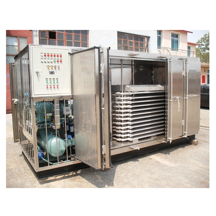 2、平板機(jī)選用經(jīng)特殊工藝處理的平板蒸發(fā)器,具有較高的光潔度和良好的導(dǎo)熱性,選用高強(qiáng)鋁鎂合金材料,液壓升降系統(tǒng)平穩(wěn)可靠,熱氨(氟)脫模出貨,安全便捷,外形美觀。